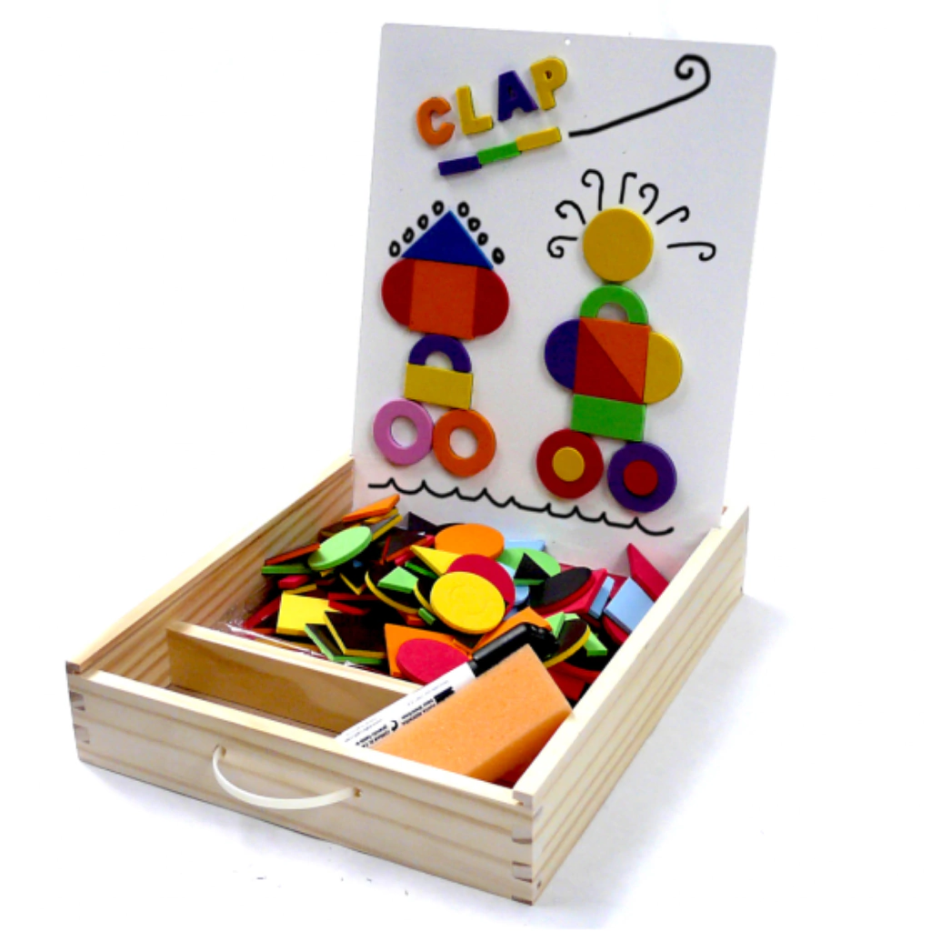 Caja con formitas imantadas de colores + letras y números, para diseñar y dibujar formas sobre la tapa metálica.