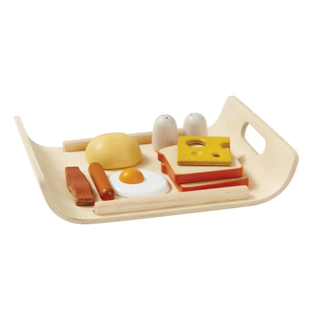 El Set de Desayuno incluye 2 rebanadas de pan, un pancito, una salchicha, una rebanada de panceta, queso, un huevo frito, sal, pimienta y una bandeja.